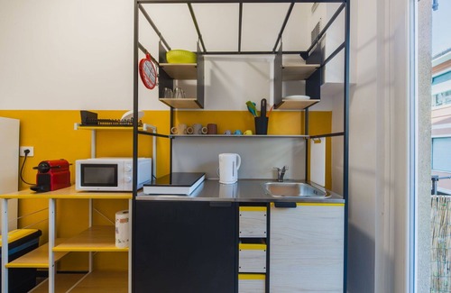 the apartment is equipped with a small kitchen, complete with 2 induction hot plates, a kettle, a microwave, and an electric coffee machine for your convenience The bathroom has a shower, bidet, and toilet. Heating options include gas heating, air-conditioning, and forced-air heating for your comfort. The unit also comes with a washing machine and a hair dryer for your use.