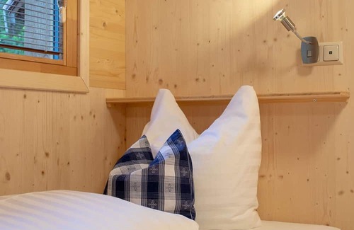 "glamping lodge b", 2-room mobile home 33 m2 Object suitable for 2 adults + 2 children. Cosy and wooden furniture furnishings: living/dining room with dining table, kitchen corner and satellite TV (flat screen). Exit to the terrace. 1 double bedroom. Gallery with 1 double bed. Kitchenette (oven, dishwasher, 2 ceramic glass hob hotplates, kettle). Shower/WC. Heating. Parquet floors. Terrace furniture. Facilities: hair dryer. Internet (WiFi, free). Instead of an enclosed bedroom, some sleeping areas are located in an open-plan area (gallery, alcove, etc.).