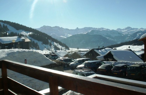 View of the mountain ranges and slopes, in the center of the resort of Saisies 1650 35 m² apartment very well equipped (dishwasher, micro wave, oven, hob, large fridge, toaster, raclette fondue ..)