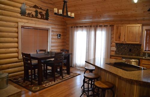 our cabin has 2 bedrooms and 1 full bath on the main level with an open living room, dining room, kitchen area There is a loft area upstairs with 2 queen beds and a bathroom with a shower. The kitchen is fully furnished with everything you will need for preparing meals. I have some spices, oil, Pam spray, sugar, brown sugar, flour, etc. I also will try to always have instant oatmeal, pancake mix/syrup, little boxes of cereal and hot chocolate, coffee. At least something to get you started if you get in late. You are close to restaurants a few within 5-10 minutes and many options 10-35 minutes away. There is the Robins Roost grocery store about 10-15 minutes away.