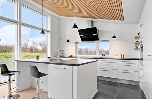 this elegant vacation home has a real danish feel-good atmosphere The light-flooded living room with its large windows and open kitchen provides a place where you can get together, play and relax. The dining table provides space for meals with the whole family. And the cozy sofa corner invites you to relax. Enjoy the view of the garden, where your children can play and run around. Or perhaps watch an exciting movie at the end of the day. On the terrace of your vacation home, which runs around the entire house, you can relax in the shade or in the sun, depending on your mood. Play fun ball games with your children on the lawn and enjoy the free time and fresh air.