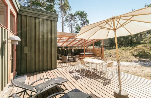 This well-equipped and cozy cottage was planned by the architect so that you can spend a wonderful vacation in it not far from the beach. It has 2 bathrooms and nice terraces and outdoor jacuzzi. Outdoor shower is also available. The house is comfortable and modern, it offers free internet and is suitable for a vacation regardless of the season. The large open plan kitchen/living room is flooded with light and it opens onto the terrace. There is comfortable garden furniture here. You also have it cozy in the living area, there is a fireplace stove. There are 3 bedrooms and 2 sleeping lofts in the house. In the surrounding area there is a rich wildlife, in general, the whole neighborhood radiates comfort and tranquility. You are in a beautiful nature and not far from the 18-hole golf course, which is located on Dueodde.