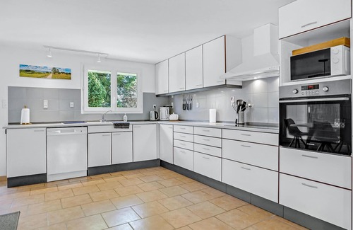 the center of the house is the large living area with cozy sofa, large dining table and open kitchen where you can spend many social hours with family or friends eating or watching tv The three bedrooms are all equipped with double beds and offer good retreats after a long day of vacation. With baby chair, crib and changing table, the house is also a good place for a vacation with child. On rainy days, entertainment is provided with Chromecast, cable TV, Wi-Fi and co.