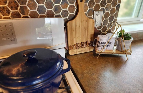 the open concept of the main level kitchen, dining, and living with half bathroom allow you to spend time with your guests, all in one area The living room includes an electric fireplace as well as a 55" Smart TV. Whether you're bringing out your inner chef in the fully stocked kitchen, playing board games at the large farm table, nestled up by the fireplace enjoying the breathtaking views of Pikes Peak mountain range, or spending the evening on the front patio using the outdoor grill. There's no lack of things to do at this property.