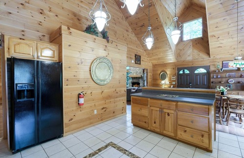 savor serenity: step inside where soaring pine ceilings and rugged exposed beams crown a great room bathed in soft, natural light Walls of rich timber glow with warmth, while gleaming wide plank floors stretch out beneath your feet, instantly setting a mood of rustic elegance and mountain calm. Kitchen & Dining: The heart of the home pairs custom pine cabinetry with easy-care counters, accented by graceful scrollwork pendants. A raised breakfast bar with iron stools invites conversation over morning gatherings, while the bay-window dining nook—topped by a Tiffany-style pendant—offers a charming stage for family dinners. Hearth & Harmony: Plush leather seating circles the floor-to-ceiling river-rock fireplace crowned with a big-screen TV. Picture windows frame the forest, ceiling fans whisper above, and the entire space feels designed for connection, comfort, and unhurried evenings.see Amenities for more.
