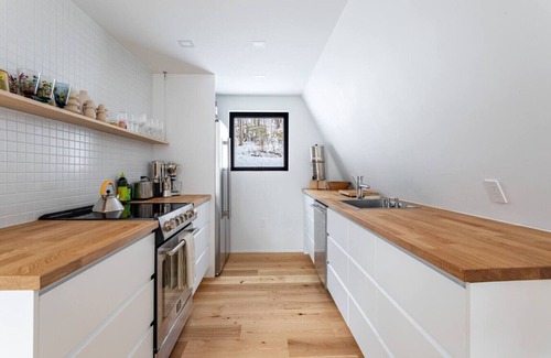 this sleek galley-style kitchen blends nordic simplicity with modern function Butcher block counters, open shelving, and stainless steel appliances make meal prep a pleasure—especially with calming forest views from the large picture window.