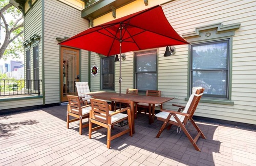 upon entering through the front gate, guests will be immersed in the elegance of the curtis park club The front lawn is beautifully landscaped with lush greenery and communal areas for guests to eat a delicious lunch from a local eatery. Looking for outdoor adventure? There are several boutiques and local restaurants steps away from The Curtis Park Club. For natural homebodies, there are two indoor communal areas. The downstairs communal area is smaller, but beautifully decorated with perfect seating for five guests. Upstairs, there is a larger communal area that seats twelve to fourteen. In these inside communal areas, guests are welcomed to interact with other travelers, indulge in a novel, or take photos with their friends.