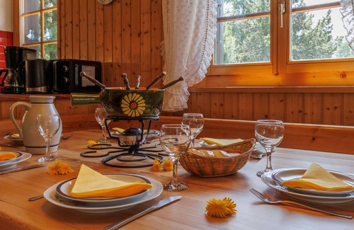 "notre rêve", 4-room chalet on 2 levels Tasteful and cosy furnishings: living/dining room with Scandinavian wood stove, dining nook, satellite TV, flat screen and radio. Exit to the patio. Open kitchen (4 hot plates, oven, dishwasher, toaster, kettle, microwave, electric coffee machine, Capsules for coffee machine (Filter), raclette grill, fondue Set (chinoise, cheese)) with hatch. Sep. WC. Upper floor: 3 rooms, each room with 2 beds (90 cm, length 200 cm). Bath/shower/WC. Balcony, large patio. Terrace furniture. Marvellous view of the mountains, the ski run and the countryside. Facilities: washing machine. Internet (WiFi, extra). Parking at the house. Please note: non-smokers only.