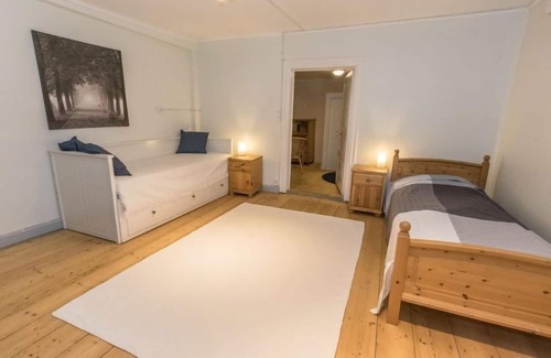 there are three bedrooms in the apartment: 1 bedroom 160 cm double bed (masonry heater), 2 bedroom two separate 90 cm wide beds (masonry heater), 3 bedroom 90 cm bed and spreadable sofa; 90 cm wide bed in separate space Spacious kitchen, shower, WC in the washroom. There is no separate living room in this apartment, one of the bedrooms can be used as a living room, there is also a TV. Shared covered cooking area in the yard, no own sauna.