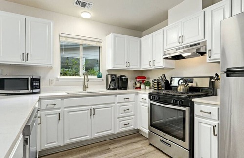 inside the home, you`ll have plenty of space to spread out or enjoy the open-concept living area to gather around for some delicious meals, play board games, or spend time with your travel companions! the family room offers plenty of seating with a queen-sized pull-out sofa, a large smart tv, games, a vinyl record player, several vinyl records provided, and plenty of seating The kitchen is fully equipped with items like a Keurig, coffee pot, KitchenAid stand mixer, crockpot, blender, toaster, cooking essentials, baking pans, cookie sheets, and more... you will have everything you need but the ingredients! Down the hallway, you`ll find the 1st bedroom which holds a queen-sized bed and a desk- perfect for working remotely! The 2nd bedroom holds a queen-sized bed, and its own Smart TV, and utilizes the full bathroom in the hallway with a bathtub/ shower combination. In the back of the hallway is the primary bedroom with a king-sized bed, Smart TV, and a beautiful ensuite bathroom with a luxurious walk-in shower, toilet closet, double vanity, and large full-sized mirror. the hallway also holds a laundry room with a half bath!