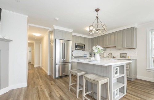 we truly love gathering at the large kitchen island to share a cocktail, enjoy meals, or play games together The open floor plan and fully equipped kitchen make this home an easy choice for "dinner in". The private beach is only steps away and has ample room to lounge and enjoy the beautiful weather. For the health-conscious guest, Rory's Market and Kitchen is only 1 mile away - we love their "works" avocado toast, acai bowls, and fresh juices. For those days when only an ice cream will do - Sundae School is dangerously close! For delicious meals and the best service, the Ocean House is a short 700-ft walk away. The Rooftop at the Pelham House Resort is another great choice and is only 1/4 mile away. last, but not least, we love lounging in the adirondack chairs overlooking the ocean with a crisp glass of wine before dinner!