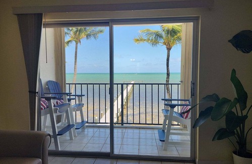We are delighted to offer this 2 bedroom, 1 1/2 bathrooms OCEANFRONT TOWNHOUSE!!! Breathtaking views off of all 3 balconies catching the sunrise and sunset. This home can sleep 4 people with a pull out sofa and one of the upstairs bedrooms has a king size bed with a daybed. Upstairs you will also find a nicely updated full bathroom between the 2 main bedrooms. The second bedroom has a king size bed with a balcony overlooking the ocean. Spacious closets and we pride ourselves on cleanliness. Kitchen has a dishwasher, refrigerator, stove, microwave and is equipped for preparing all your meals. Towels and linens are provided. Washer, dryer and air conditioning available. Amenities include Gated Community, Pool, Longest Private Fishing Pier in Islamorada, Sauna, Club House, Gym with Ocean View, Additional freezer to store FISH in, Elevator, and Covered Parking. Launch your paddle boards or kayaks right from the pier. conveniently across the street to founders park, close to theatre of the sea, shopping, oceanfront restaurants, snorkeling reefs, scuba diving, world class fishing, and marine life galore!!! this place is just waiting for you to unpack, relax, and experience the joy of life!