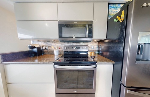 this home offers one bedroom suite on the bottom floor with a queen bed and a master bedroom upstairs with a private bath and a second bedroom with a queen bed The living room contains all new furniture with a large flat screen tv, as well as a new dining set and kitchen bar stools. The kitchen is newly renovated with all stainless steel appliances.