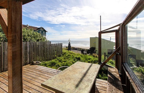 nye beach is just beyond your doors and can be accessed by walking 50 steps down a set of stairs to the beach turnaround Feel free to walk your dog on the beach if the home’s small yard is not enough space. since this home is right in between the visual arts center and the candy store - and within a short walk of quirky shops, amazing restaurants, and even a fun park - there's something for everyone nearby! whether you’ve come seeking rest and relaxation or action-oriented rejuvenation, this central oregon coast getaway can’t be beat!