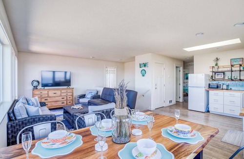 climb the stairs to your very own octopus den, an upper-level beauty in newport with glorious views of the pacific This guest house gives you all you’ll need for a great stay in a coastal city rich with activity and natural beauty, whether you plan a trip to the Oregon Coast Aquarium, the bustling shops of the historic bayfront, delicious seafood from the fleet of fishing boats in the marina, or time on its spacious, flat sand beaches mere blocks from your home away from home. Contemporary furnishings, including sleek sofas in the living room and fresh bedding in the two bedrooms, open space, and new flooring promise an uplifting, inspiring stay. Large windows let in ocean light, and the upper deck gives you a wonderful spot to enjoy views, breezes, and magnificent sunsets to end your day. An open, fully equipped kitchen gives you the option to eat in, or you can walk to several dining spots, including the oceanfront Georgie’s in a nearby hotel, or several options in the Nye Beach area. Downstairs, you will find a relaxing hot tub and a partially fenced yard. The Newport Performing Arts Center is just a few blocks away, so you can time your visit to live music, art, drama, or a Newport Symphony performance.