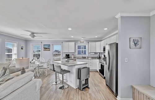 the top floor of the home provides ample room in the open and inviting living space This living space offers a 65" smart TV with a sound system for family entertainment. The spacious kitchen provides plenty of countertop space and updated appliances, as well as access to the balconies for the sound or beach side. The kitchen is well stocked with a coffee bar for your morning energy as you watch the sunrise over the beach. There is a tea bar for you to enjoy as you relax in the evening sitting on the back deck watching the sunset. Off the living room sits a bedroom that has a Queen bed and a 45" smart TV, with a shared full bathroom.