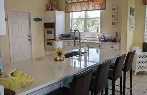 - create amazing meals while smelling and hearing the ocean through the large windows in the kitchen kitchen is well-equipped with stainless double ovens, lots of counter space, french door refrigerator and an extra mini refrigerator for added grocery storage!
