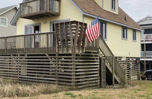 Oceanside beach cottage with panoramic views from upstairs master bedroom and downstairs living area and decks, you will think you are oceanfront. Walking distance to Jeanette's Pier and the Outer Banks Fishing Pier. Newly updated with beautiful woodwork details, appliances, and furniture. You will definitely feel at home with the charming and cozy décor. Private street with no traffic.