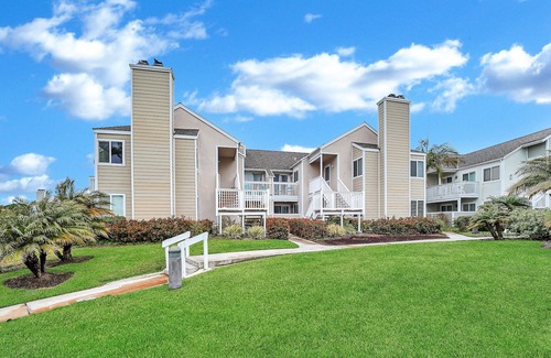 this ocean facing second story condo has an abundance of natural light The interior features new plank flooring, fireplace, a comfortable family room with plenty of seating, dining area, kitchen with quartz countertops, a large primary suite with a king size bed. The second bedroom features 2 twin beds and there is a full size sleeper sofa - perfect for sleeping 6. A private balcony off the second bedroom is perfect for watching the sunset over the ocean. A full size washer and dryer are located in a closet in the second bathroom. Each bedroom offers large closets with an abundance of storage.