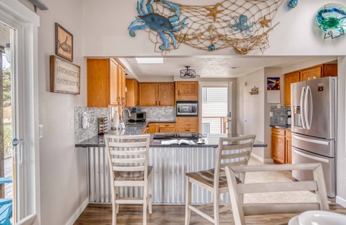 with ocean views and an extensive outdoor living area including a hot tub, chinook overlook will change your outlook to one of rejuvenation and fun Located near Chinook Winds Casino and a half block to the beach, this amenities-rich home puts you in a great place to enjoy all that Lincoln City has to offer. An upper-level, skylit great room gives you views inside and out: an elevated dining table puts you high enough to enjoy ocean views while you eat, and a deck festooned with chairs opens to a panoramic view of sea and sky, and Cascade Head. The roomy, well appointed kitchen makes it easy to invite cooking help; with a quartz breakfast bar and loads of appliances, it’s a natural gathering hub. A very comfortable queen sofa sleeper and large-screen TV near the pellet stove promise a cozy spot for the evenings. The main level includes a spacious primary bedroom with a king bed, TV and day bed with trundle. This level also has a full bath with a beautiful walk-in shower.