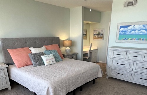 this lovely rental with a spectacular view is new to our company Prepare to relax and enjoy this newly painted and decorated oceanfront condo with all the amenities one desires for a great stay at the beach. Spectacular ocean views from the master bedroom and living areas. Easy stroll to FLagler Ave for dining,shopping, music and fun. All new bedding to relax and enjoy the sunrises and moonrises right from your king bed! Twin beds in the second bedroom. No pets allowed in Golden Arms.