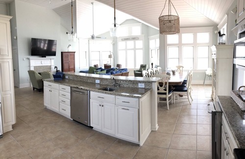 • level 3: mbr (k) lounge chair & private deck; mbr (k) with closet large enough for pack n' play, great room with ocean views, 70” flat screen, dvd, blu-ray, ipod docking, bose sound system, gas fireplace, 8 person game/dining table; kitchen with granite countertops, double ovens, double sink areas, double dishwashers, under-counter icemaker; dining area with 10 person table, island seating for 5, sofa console seating for 4; sunroom; ship's watch; half bath