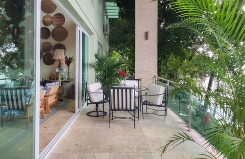 Within an area of 300 thousand square meters of preserved Atlantic Forest, in a high-end condominium with only three properties and a private beach with warm and crystalline waters, we find this exquisitely decorated house that combines high-end furniture and materials with the typical Brazilian handicraft.