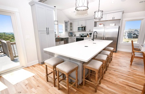 top level: great room with flat-screen tv, electric fireplace, desk, oceanfront deck access with ocean views and outside dining table Kitchen with 2 ovens, 2 dishwashers, beverage cooler, 2 refrigerators, island with prep sink, counter seating for 6 and deck access. Dining area with 3 tables seating 20+, half bath, and 2 King Master Bedrooms each with flat-screen TV, private bathrooms and deck access.
