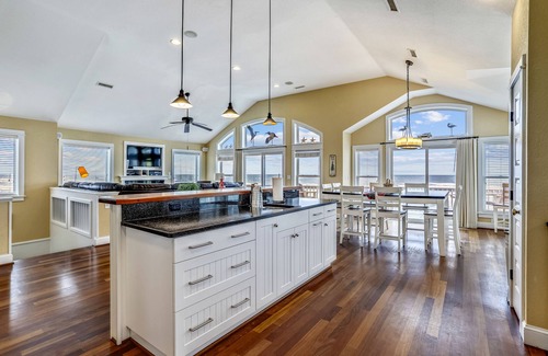 top level: the open floor plan boasts plenty of dining room seating and a fully equipped kitchen ready to take on any meal you need during your stay! two dishwashers are available for your convenience, and the chef in your family will be pleased with the top-of-the-line appliances! there is island seating for 4 and the seating at the dining room table is roomy enough for 10, so all can enjoy an outer banks family dinner you can also surround yourself with ocean breezes and tranquility while relaxing in the elegant furnishings in the great room and taking in the unobstructed ocean views! spend a cozy evening relaxing in front of the gas fireplace, or share morning coffee or evening cocktails on the open sundeck while whale watching or looking for dolphins! a luxurious king master suite on this level with a garden tub, too!