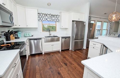 top level: great room with 65" smart tv and deck access Kitchen with counter seating for 5, 2 refrigerators, ice-maker, 2 dishwashers and an elevated ships watch with dining for 4. Dining area seating 10, half bathroom and a King Master Bedroom with smart TV deck access and private bathroom with whirlpool tub. screened porch off kitchen and crows nest with sound and ocean views!
