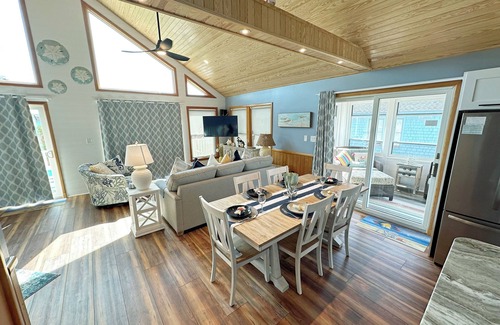 great room with living, kitchen, and dining area, queen master bedroom with full bath Access to the top wrap-around sun deck fully furnished with deck furniture. access to the 3 season sun room furnished with comfy chairs