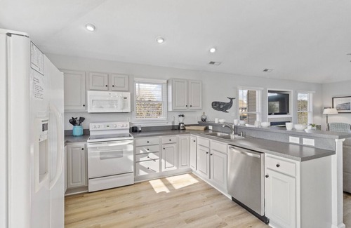 after a long beach day, or an afternoon spent lounging by the pool or hot tub, step into this haven of relaxation, where every detail has been meticulously crafted to ensure your comfort and enjoyment From the moment you enter The Lucky Duck, you’re greeted by bright open spaces and coastal, beachy décor. Flooring has been upgraded to luxury vinyl throughout, and fresh paint provides a clean and refreshing welcome. The kitchen is well-equipped to host meals for your entire group, and there is ample seating at both the bar and dining table for the whole family to gather. Connect and enjoy family time in the open living area, complete with comfy seating and a large screen TV.
