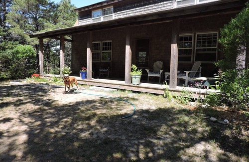 Relax and enjoy the best of both worlds: beach and nature during the day and Edgartown at night. The property is across the street from 400 acres of pristine conservation land (Wasque reservation) with panoramic ocean views and boardwalks to swimming and fishing beaches. Just down the road ( a 5 minute walk) is Katama Bay where you have access to clamming and shelling. The main house has three bedrooms, two baths, living room, kitchen. Ocean/bay views from living room, bedroom and deck. Second building has large recreation room and large open bedroom overlooking bay and ocean. The open deck and covered front porch always always allow you access to the outdoors..