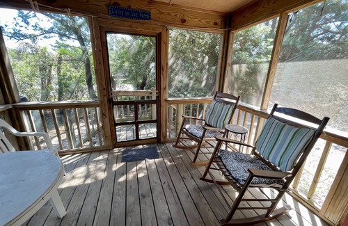 Surrounded by trees and nicely secluded, this comfortable Ocracoke Island cottage offers a great vacation opportunity for a small family. Relax on the screened porch.
