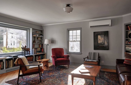 step inside and feel instantly at home in a space that is warm, inviting, and timeless Right across the street from the Boarding House, the Old Ross House offers the same Shaker-inspired palette of contemplative blue, green, and gray. Wood floors, old Persian rugs, a library for browsing, and linen bedding continue the aesthetic of the Boarding House. Spacious common areas include a living room, dining room, kitchen, screen porch, and lower-floor den with a stone fireplace.