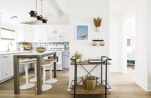 the jim robertson house is newly updated with special touches that make it unique You will enjoy the quiet comfortable neighborhood. The three-bedroom, two bath home sleeps 6. The backyard provides an outdoor oasis with shaded patio, grill, firepit, dining table and living space.