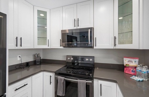 the kitchen is fully-equipped, so you can cook meals just like you would at home The countertops are spacious, and the appliances are new and easy to use. You’ll have everything you need to prepare your favorite dishes and enjoy a home-cooked meal.