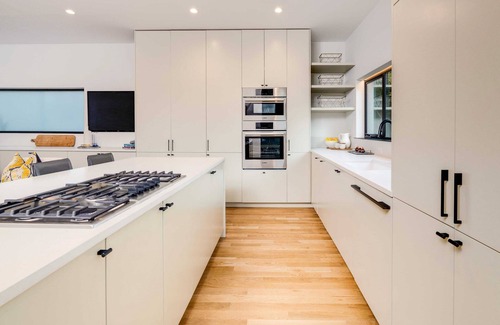 inside, it's all about comfort and style: think beautiful white oak floors, cool velux solar venting skylights, blackout window shades, and a sleek floating metal staircase And if you're eco-conscious, this home is prepped for solar power and an electric vehicle. Oh, and that two-story opaque window front? It's made from Kynar—a super tough, flame-resistant, UV-stable material. cool, right?