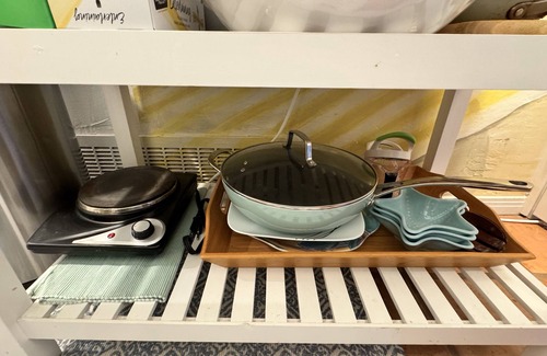 large flatscreen lg smart tv is swivel mounted for various viewing options Closet has a three-drawer dresser, and hanging rods w/plenty of hangers. Iron, extra linens, and beach towels are located in the closet. The hallway transition to bathroom hosts a small ‘kitchenette’ with a 4-foot compact refrigerator (sep. freezer compartment), coffee set-up, and microwave. Butcher block kitchen cart is stocked with dining and food prep utensils, wine & can opener, knives, cook plate, electric kettle, and drip coffee maker. Coffee bureau has a Keurig coffee maker, coffee pods, mini creamers, sugar/splenda, stoneware mugs, plates and bowls, glasses and wine glasses. There is an additional compact fridge located in the bedroom closet, great for beverages and extra groceries.