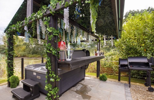 finishing off with a unique outside space, offering the perfect relaxation and entertainment all in one setting A luxury hot tub, with a floral ceiling, overlooking the lake. Tub chairs surrounding a log burner, with throws provided for those colder nights.
