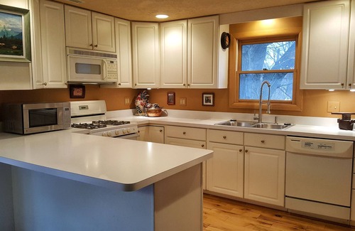 Treetop Lodge is a beautiful, restful 2nd floor lodge retreat with charm & whimsical touches throughout. Featuring a large common room, 2 bdrms with quality queen beds, bright FULL kitchen, private front door entrance, large balcony deck, all white linens + more.