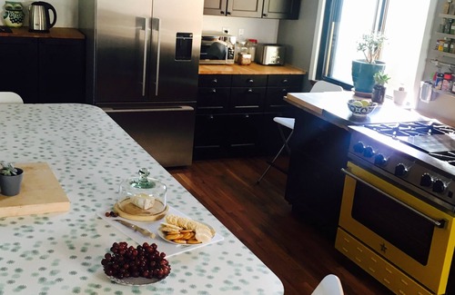 the kitchen is well equipped with everything you’d expect, along with a tea pot, french press, hand mixer, waffle iron, crock pot, roasting pans, baking tins, pasta, grains, hot cocoa, teas, sugar, spice, and everything nice