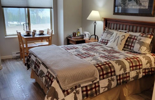 The Canadiana room is a 1 bedroom studio suite with bathroom. Located at Mt Washington's beautiful Bear lodge. This studio is equipped with coffee, microwave, hot tub in building, TV, Wifi, table for two and a queen bed. Endless views and spectacular natural settings are free. Just what you need for an overnight or weekend getaway. Ski or ride in and out. This is a mountainside studio facing the Comox glacier and other coastal mountains. The Ski lodge is within short walking distance, suitable for mountain biking and new for this season zip lining..