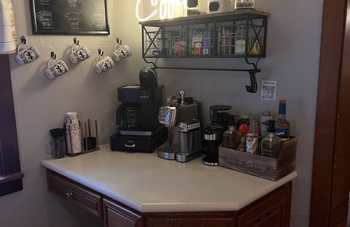 house is fully furnished with 16 person dining table a large sectional couch and oversized chairs in what we call our family room or gathering room Kitchen features a double oven, second refrigerator and elaborate coffee station - we take coffee seriously in Waupaca. It's completely stocked with large families in mind, we have several crockpots, nesco, oversized pans, electric griddle we most likely have it. Your families head chief won't have any trouble whipping up the family favorites in this kitchen. Clean up is a breeze with the dishwasher, we also have filter water and a large ice maker for your beverages.