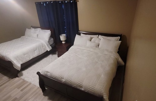 the bedroom is furnished with 2 queen size beds which sleeps 4 adults comfortably Cozy up and watch NETFILX on a 55 inch Smart TV along with blackout curtains to create a peaceful vibe.