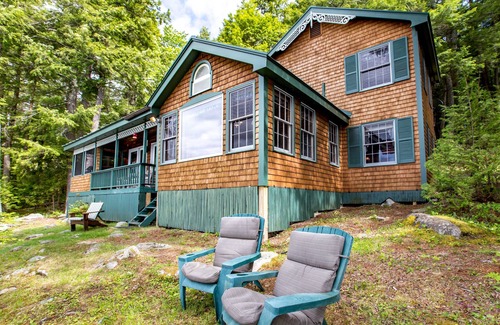 there is a covered front porch and a large screened porch The screened porch has a table with chairs and rocking chairs so that you can enjoy the evenings outside bug free listening to the loons and owls. Every year Ingham Pond is home to a loon family that likes to hang out in front of The Cottage and entertain our guests. WE STRICTLY FORBID JET SKIES AND WAKEBOARD BOATS. For your boating and swimming pleasure we offer 2 kayaks, 1 canoe and a swim float. Fishing boats can be rented from Castle Island Camps, phone 207-495-3312 and Central Maine Boat And RV Rentals, phone 207-931-8820. If you bring your own boat you can launch it at the public boat launch on Long Pond and take the scenic cruise down Long Pond and Ingham Stream back to The Cottage.