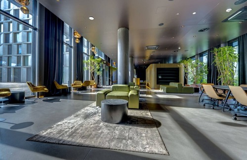 ein hauch von glamour empfängt dich, sobald du das gebäude betrittst Die Lobby ist in entspannendes, gedämpftes Licht getaucht und kontrastiert mit den schimmernden goldenen Elementen in der Eingangshalle. Der offene Bereich im Erdgeschoss bietet eine Entspannungszone, in der du dich mit anderen Personen die neu in Zürich sind, treffen und austauschen kannst.
