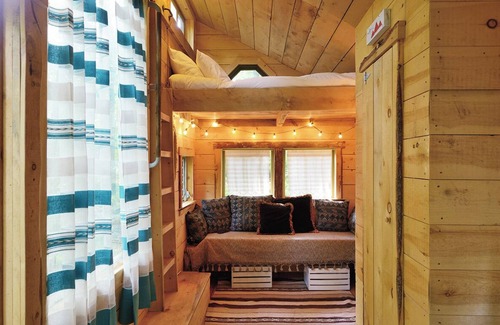 tiny house 3 is a cozy and bright and built out of rough-hewn local pine and hemlock It features a sleeping loft with a full-size bed as well as a single day bed, for a total of up to 3 guests. There is a writing nook and a closet. There are electrical outlets and Wifi. There are fans for the summer and an electric space heater for early spring and fall. Tiny House 3 guests have a private firepit, charcoal grill, hammock and outhouse. They have access to the communal outdoor kitchen, outdoor shower with hot water on demand, and covered outdoor dining area. They also have access to the communal sauna. Available mid-April to mid-November..