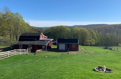 the outpost was initially built by a prior owner to serve as a motorcycle testing facility (and was later repurposed as the bovina town court before being renovated and converted into a studio apartment) As such, the front door of the Outpost opens onto a large paved area that historically served as a motorcycle training course (one windowlooks out over this area which is less picturesque than the other magical mountain views on the farm). However, the Outpost is separated from the farmhouse by rolling green pasture and rows of white birch trees and currant bushes which allows guests additional space and more privacy from other guests than the guest rooms in the shared farmhouse. The other two windows in the Outpost offer views of green pastures and birch tree rows. All windows have room darkening privacy curtains. Just outside the Outpost is a private fire pit where you can roast marshmallows and stargaze as well as several outdoor seating areas with gorgeous mountain-top views down the valley where you can see miles of lush green sloping land in spring and summer, a warm harvest of golds, reds and yellows in autumn, and billowing clouds and snowy peaks in winter. Please inquire with owner whether split wood for the fire pit is available for purchase on-site during your stay (we try to stock it but if we run out guests can purchase logs in Delhi).