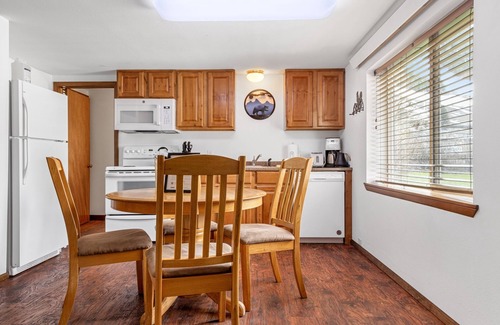 This charming garden-level condo, nestled at the base of Snow King Resort, offers a cozy retreat for a small group. Featuring one bedroom and one bathroom, this unit boasts a spacious open kitchen and living room. Enjoy a cookout with friends and family on the shared grill, unwind in the inviting communal green space outside, or simply take in the stunning mountain views.